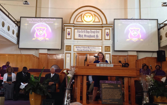 Rabbi Wendi Geffen of North Shore Congregation Israel speaks at the dedication service for Stone Temple Baptist Church.