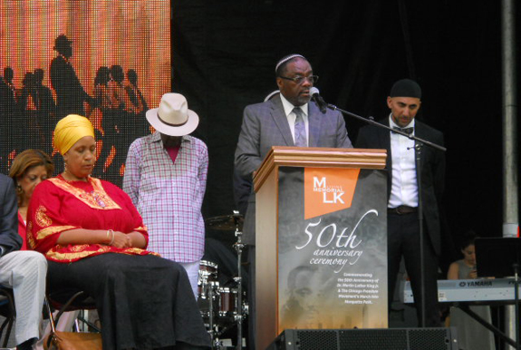 Rabbi Capers Funnye of Beth Shalom B’nai Zaken Ethiopian Hebrew Congregation gives an invocation at the unveiling of the new MLK monument in Marquette Park on Aug. 5
