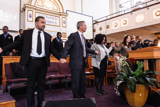 Faith leaders and elected officials in the African-American and Jewish communities join hands at the third-annual MLK Day program (Photo by Robert F. Kusel).