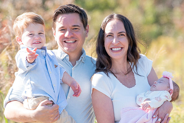Lauren Koenig and her husband sitting on a couch smiling while holding their newborn baby and their young daughter both wearing pink bows on their heads.