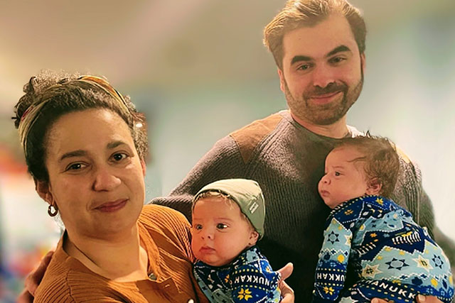 Leah Venus and her husband smiling in glasses on the floor in front of a crib with their young toddler daughter and their new born baby in arms.