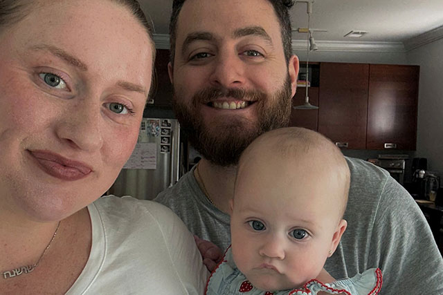 Nicole Beckmann Tessel and her husband holding their baby alongside their toddler girl standing in front of their front door of their house.